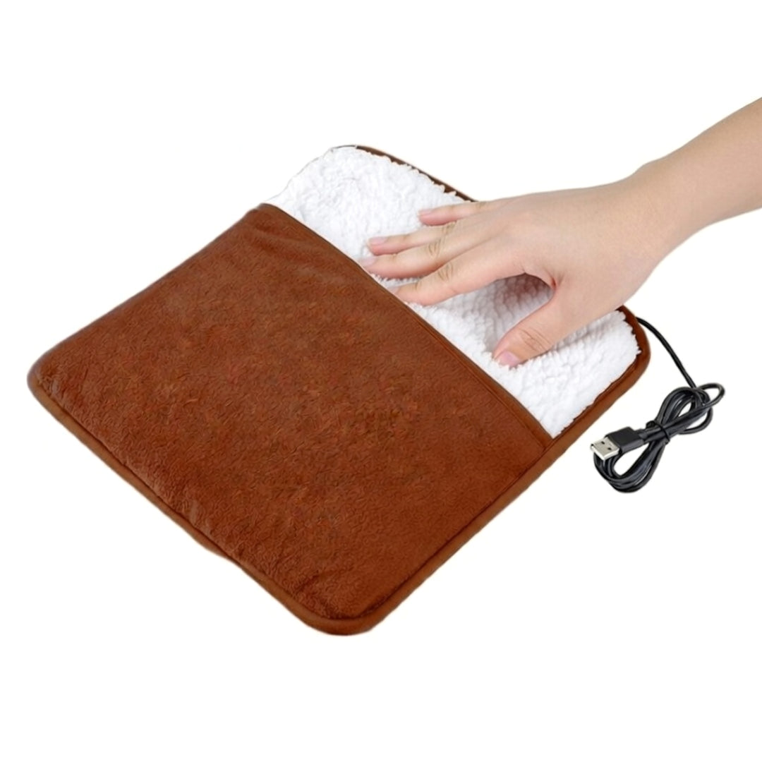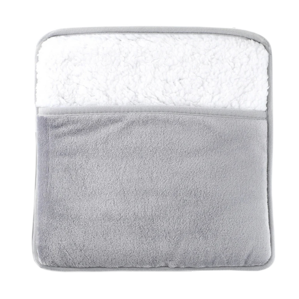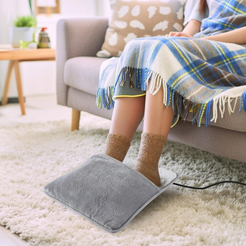 The foot warmer measures 29 x 29 x 2.5 cm (approximately 11.4 x 11.4 inches). It is designed to comfortably fit most foot sizes while remaining compact enough to store easily in a drawer or bag.